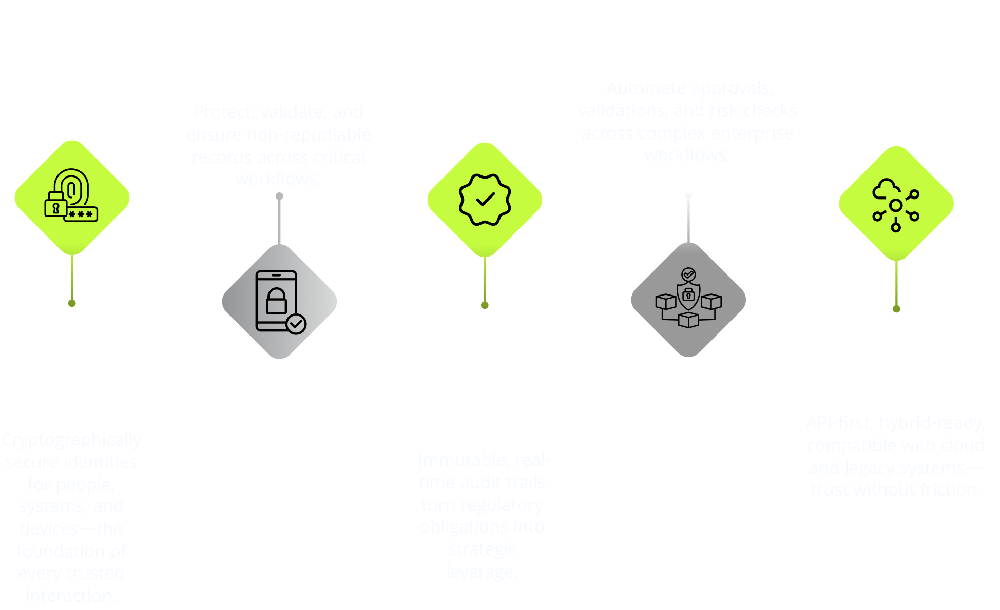 Our platform turns complex identity, compliance, and transaction challenges into verifiable, secure, and auditable outcomes—enabling enterprises to lead with confidence.